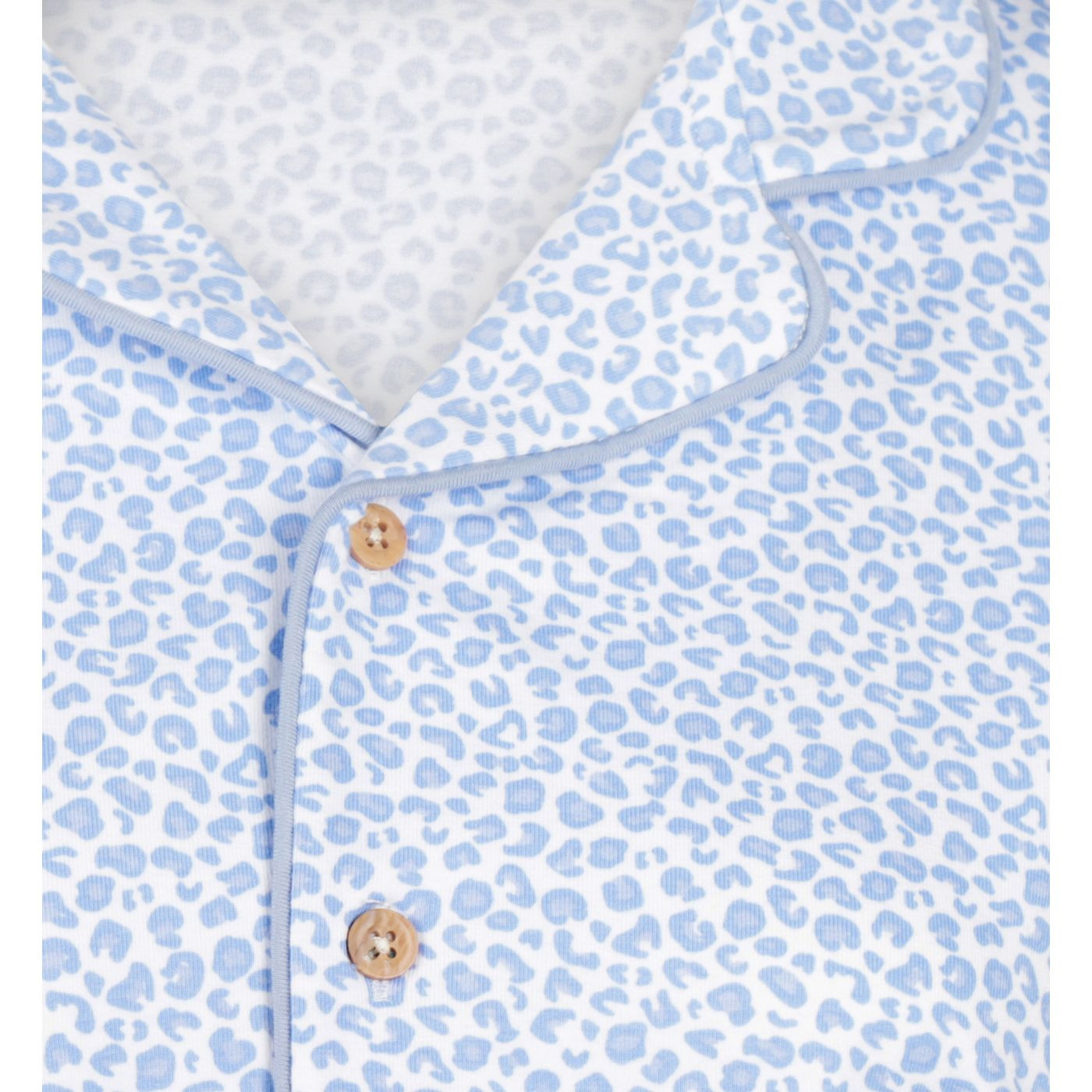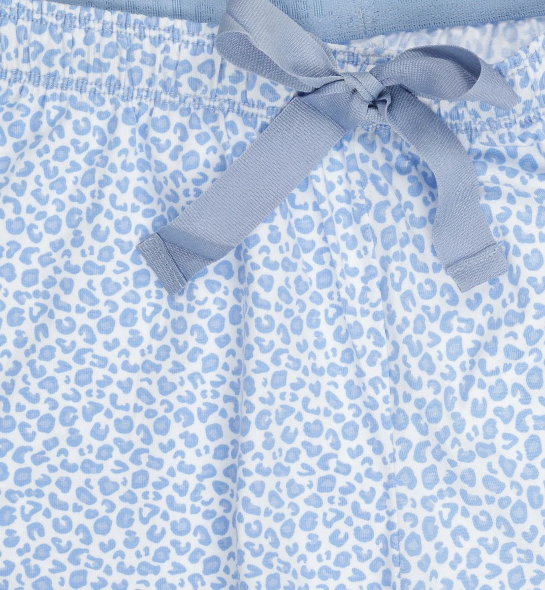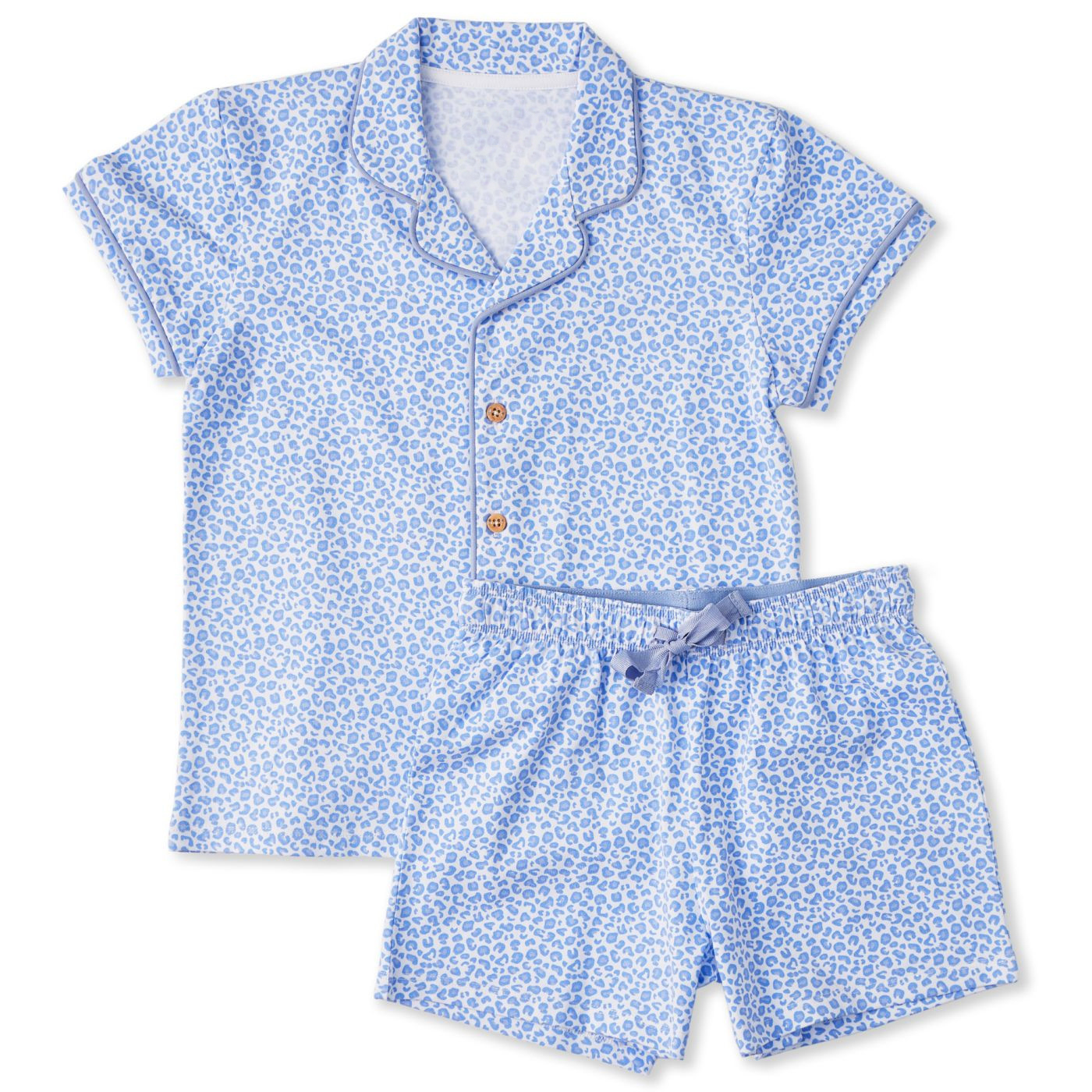 Stylish and sweet, the Bluebell Spots Sleepwear Set features a short-sleeve button-up top with matching shorts in a soft blue leopard print.