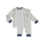 Roar into bedtime with the Dino Dreams Sleepwear Set. Covered in playful navy dinosaur silhouettes on a soft cream base, this long-sleeve set is made for cozy adventures. Finished with contrast ribbed cuffs and neckline, it’s the perfect blend of comfort and prehistoric fun for little dino lovers.