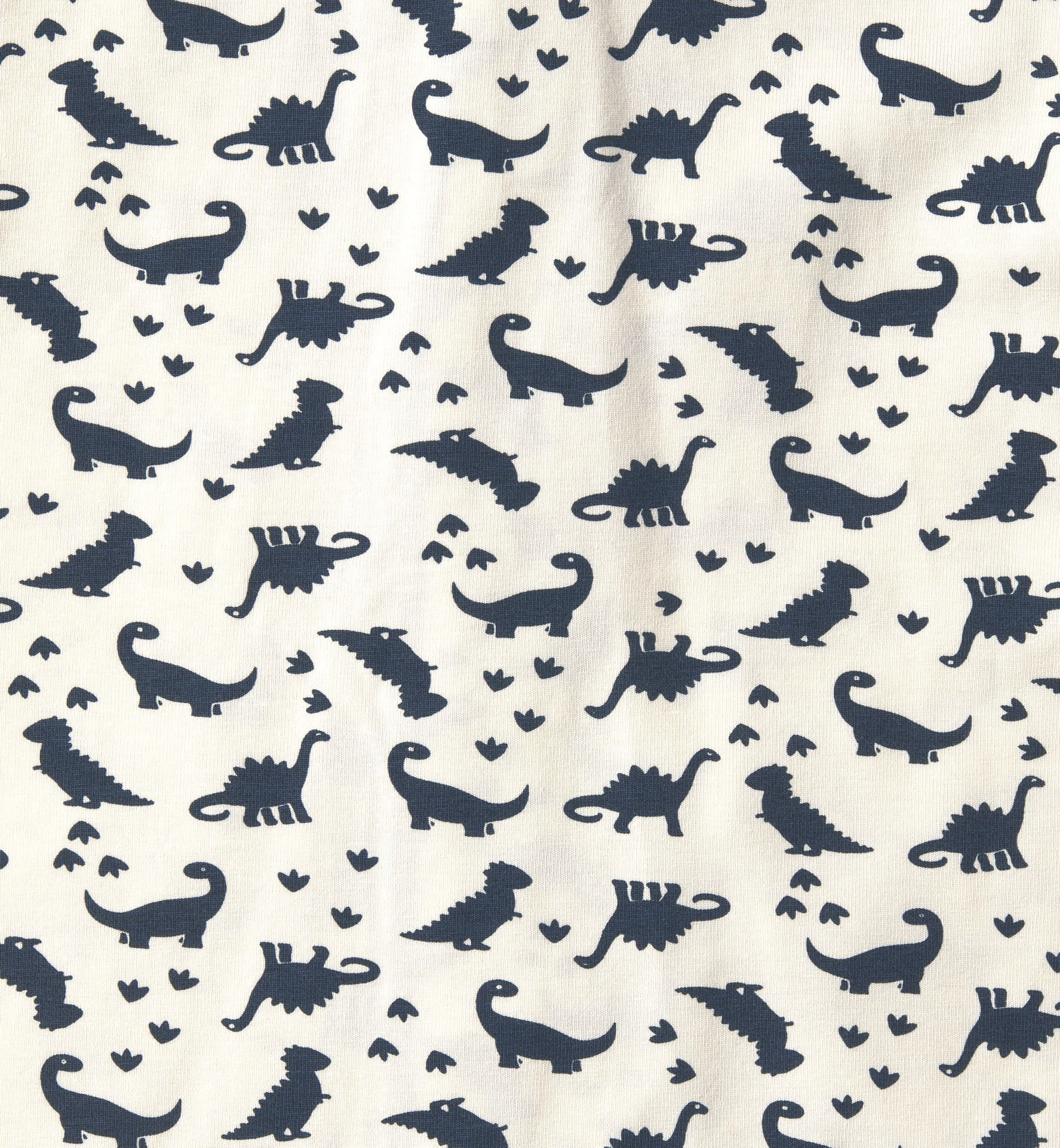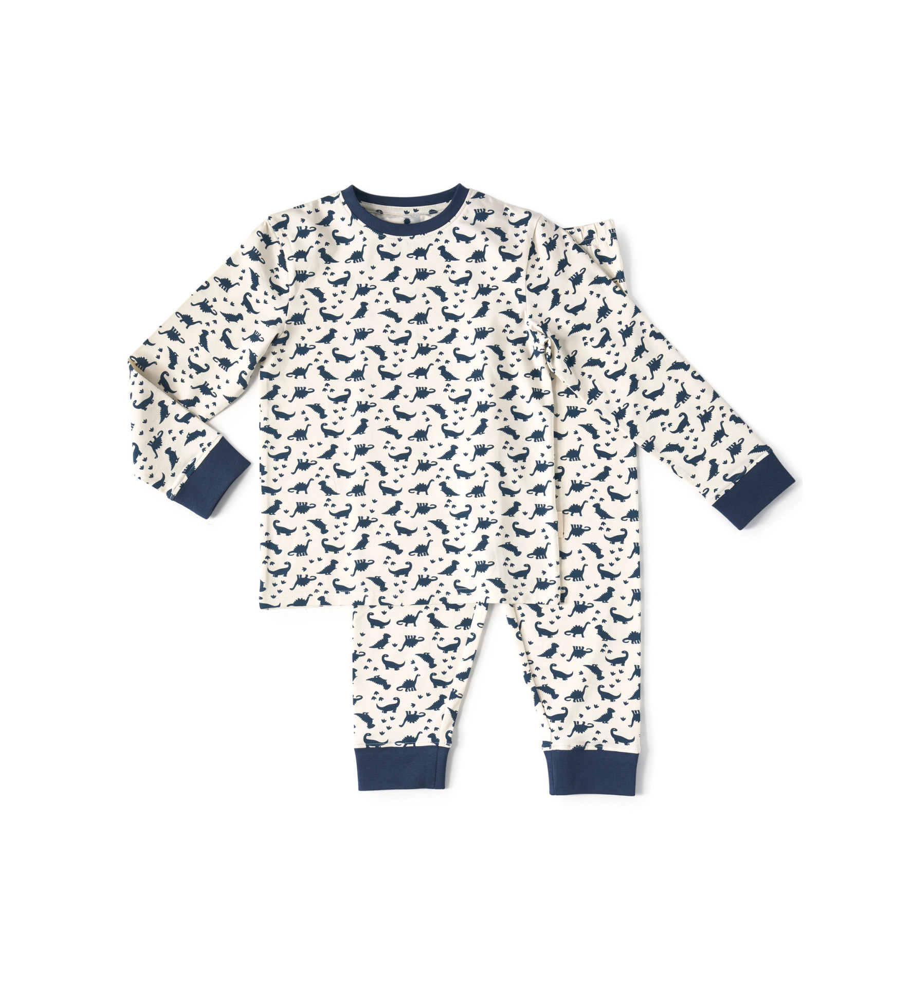 Roar into bedtime with the Dino Dreams Sleepwear Set. Covered in playful navy dinosaur silhouettes on a soft cream base, this long-sleeve set is made for cozy adventures. Finished with contrast ribbed cuffs and neckline, it’s the perfect blend of comfort and prehistoric fun for little dino lovers.