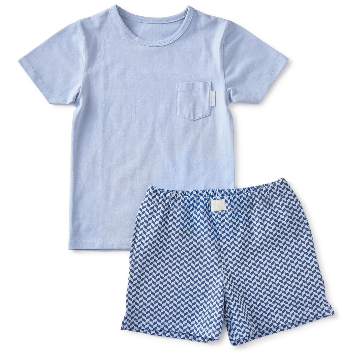 Soft, simple, and ready for sweet dreams, the Morning Sky Sleepwear Set pairs a light blue pocket tee with patterned shorts in a cool chevron print. The elastic waistband ensures easy comfort, while the airy cotton fabric keeps little ones relaxed all night long. A fresh look for bedtime bliss.