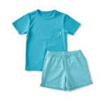 A splash of comfort and style, this two-piece sleepwear set features a soft turquoise tee with a handy chest pocket and matching shorts with a lively wave-inspired print.